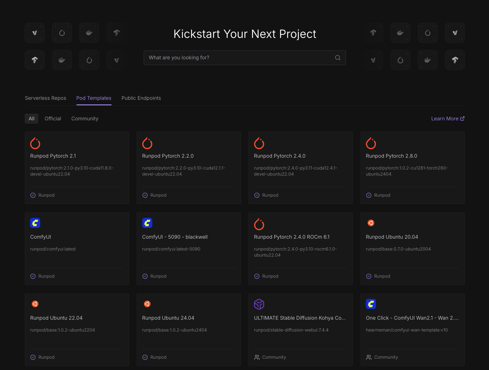 Official templates are curated by Runpod with proven demand and maintained quality. These templates undergo rigorous testing and are regularly updated to ensure compatibility and performance. Runpod provides full support for official templates.