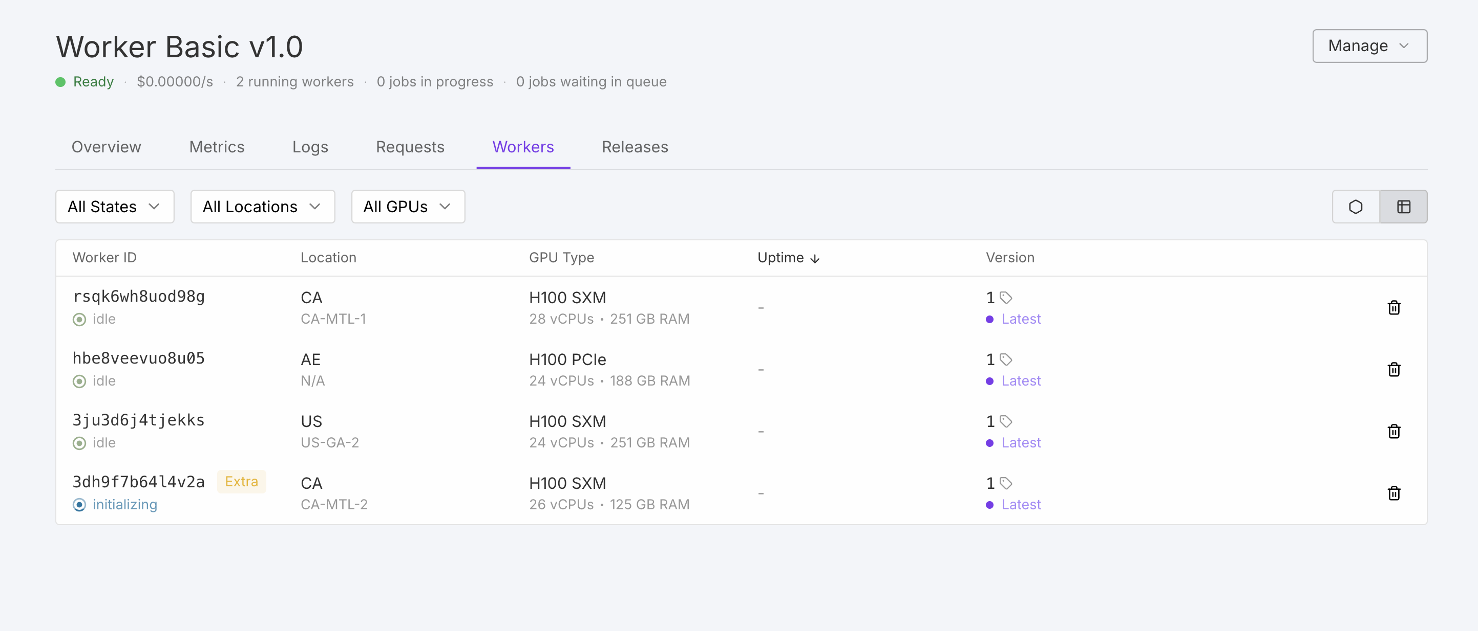 - Outdated: The system marks the worker for replacement after endpoint updates. It continues processing current jobs during rolling updates (10% of max workers at a time).